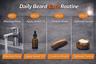 This page outlines a daily beard care routine designed to support skin health, soften beard hair, and keep your beard looking clean and controlled without overdoing it.